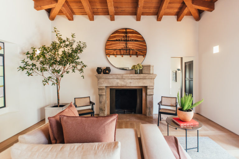 Located one block South of Sunset, the five bedroom and eight bath home sits on 17,780 square feet of verdurous grounds. The gated villa was built in 1929 by renowned American architect Ralph Flewelling and combines timeless Spanish architecture with classic Beverly Hills motifs. Redesigned by Standard Architecture, the property is surrounded by swirling grass, hand-laid basalt cobblestone, and verdant flora. Picturesque vines climb up the side of the home recalling rustic villas in Spain. The property’s elegant olive trees give the courtyard natural pockets of shade from the bright California sun. Privately nestled away among the graceful trees, a stone-lined pool sits at the center of the yard. The serene backyard also encloses a quaint casita guest house that overlooks the pool. A double garage with an adjacent gated carport adds accessibility to driving in and out of the property.